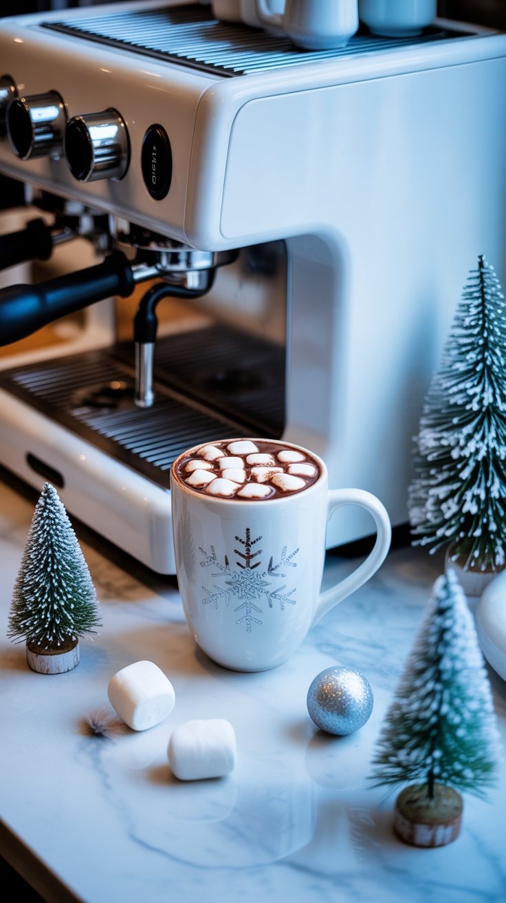 Create a whimsical forest scene right on your countertop. This simple yet effective theme uses a collection of bottle brush trees in various colors and sizes. Arrange them around your coffee maker and mugs to create a miniature winter landscape. This look works well with any color scheme, from traditional greens to playful pinks and blues.